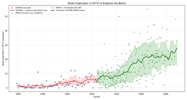 L’étude climatique menée à l’échelle d’Enghien-les-Bains s’appuie sur les données SAFRAN et les projections DRIAS, afin de caractériser les évolutions possibles du climat local à l’horizon de la fin du XXIᵉ siècle.
