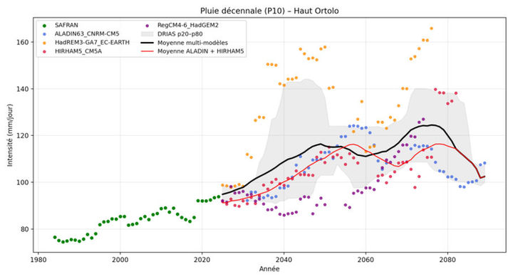 Parmi les modèles régionaux analysés (ALADIN63, HadREM3, HIRHAM5, RegCM4-6), ALADIN63 apparaît comme le plus cohérent pour ce territoire. Il projette une hausse de la pluie décennale de +22 % dès 2025 et +56 % vers 2075, avec une lame d’eau journalière moyenne passant de 79 mm à 123 mm, proche des niveaux centennaux actuels.